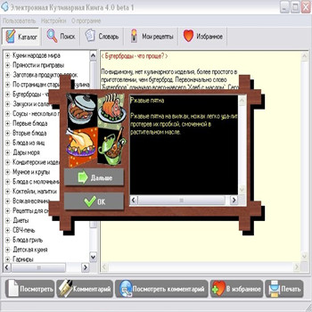 Возможности программы: - Работает почти на всех новых версиях Windows - Есть огромный каталог рецептов и интересных статей по кулинарии - Можно вывести любой рецепт на печать - Имеется функция поиска нужного рецепта по перечню имеющихся продуктов - Доступно добавление рецептов в раздел «Избранное» - Пользователь может вести свой кулинарный дневник