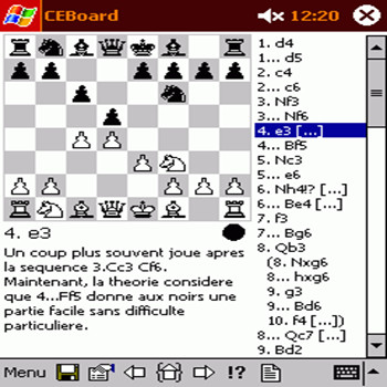 CEBoard - бесплатная шахматная программа для КПК, которая превосходно и удобно имитирует шахматную доску. Программа предназначена для игры вдвоем, записывает все ходы, а также сохраняет и восстанавливает игры в формате PGN.